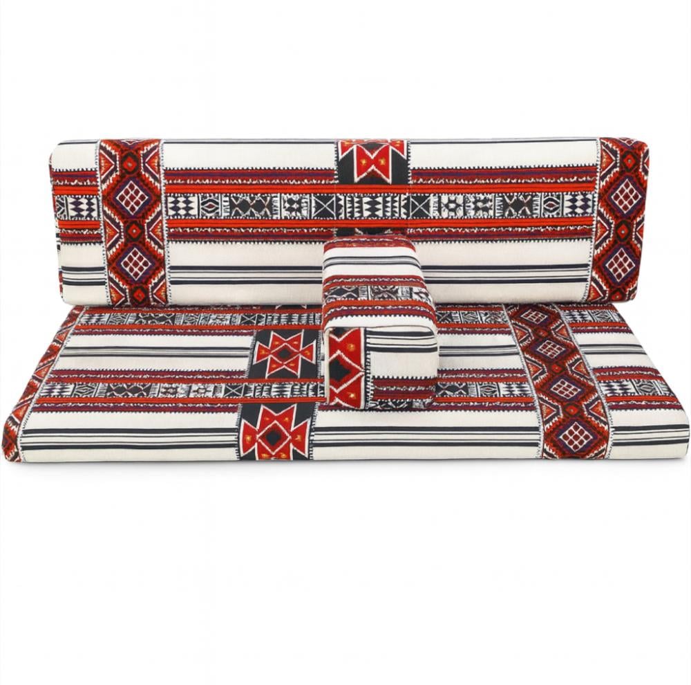 مصنوعة من قماش مزخرف بالنقشة النجدية الأصيلة، مع حشو إسفنجي مريح ومركي إسفنج مضغوط يضمن لك دعمًا فائقًا وراحة أثناء الجلوس.